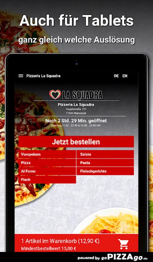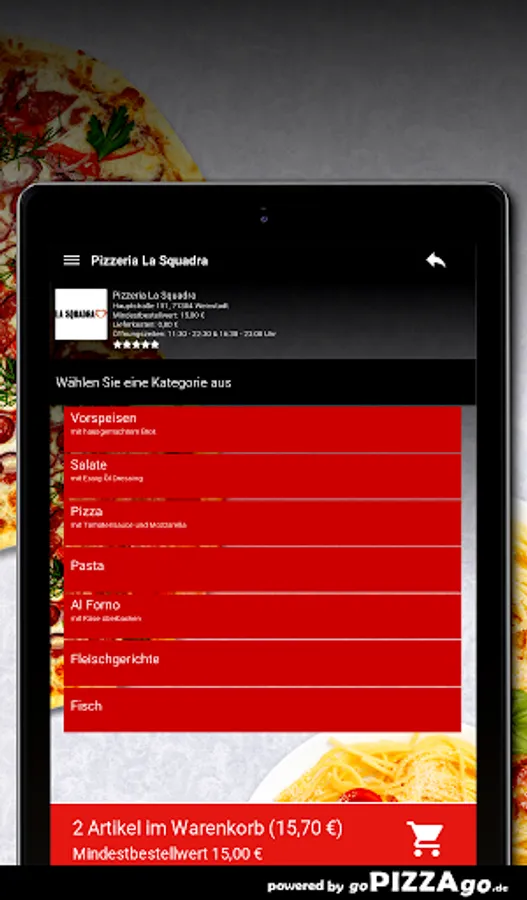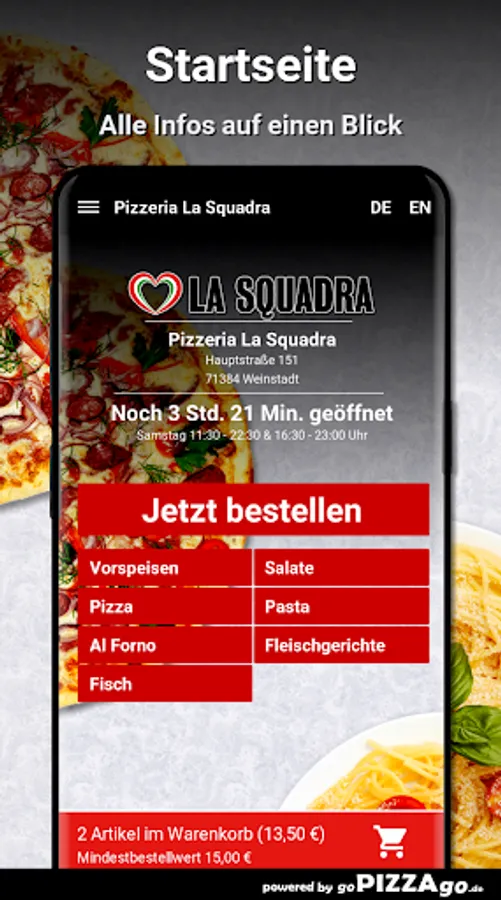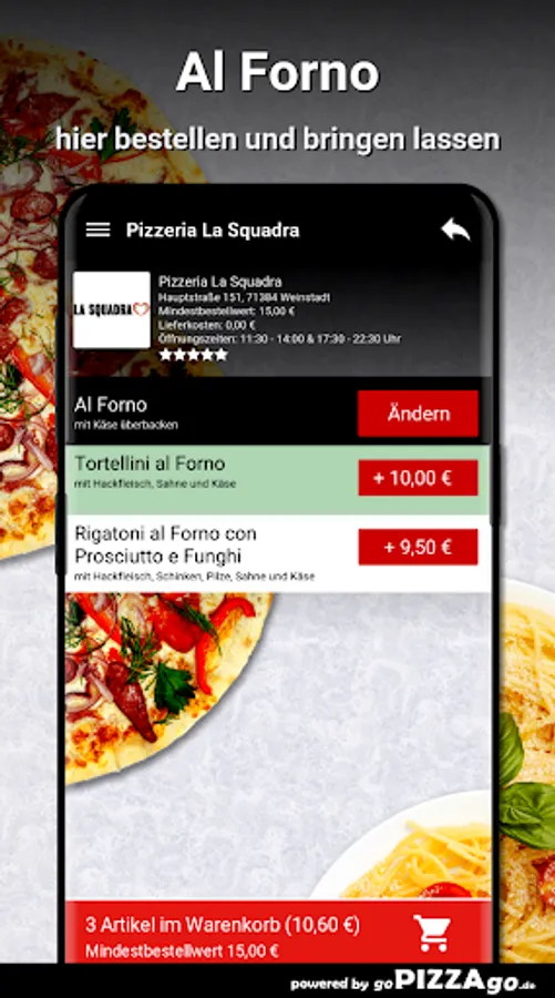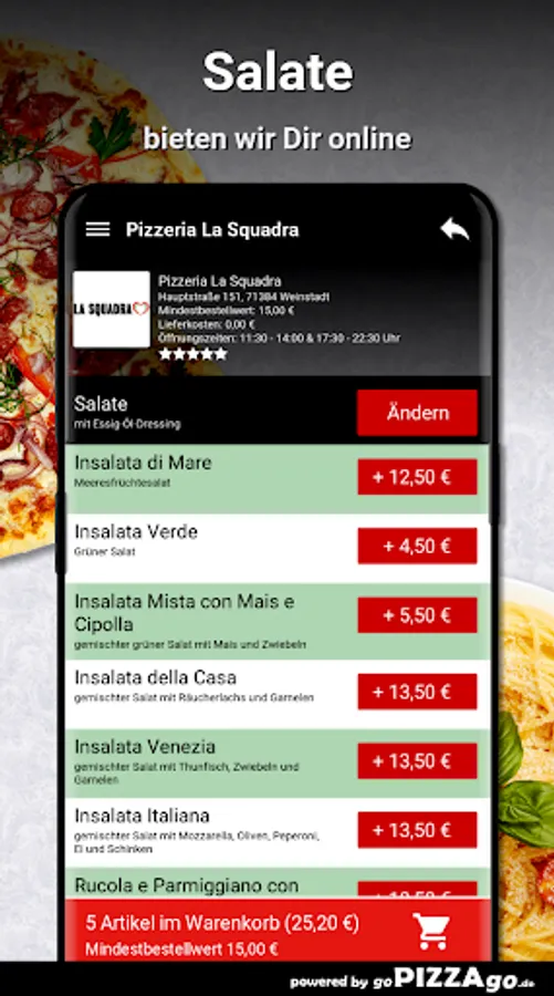 Pizzeria La Squadra - Order food in Weinstadt At Pizzeria La Squadra you can easily order and have pasta, fish, salads, starters, meat dishes, pizza and Al Forno delivered here.