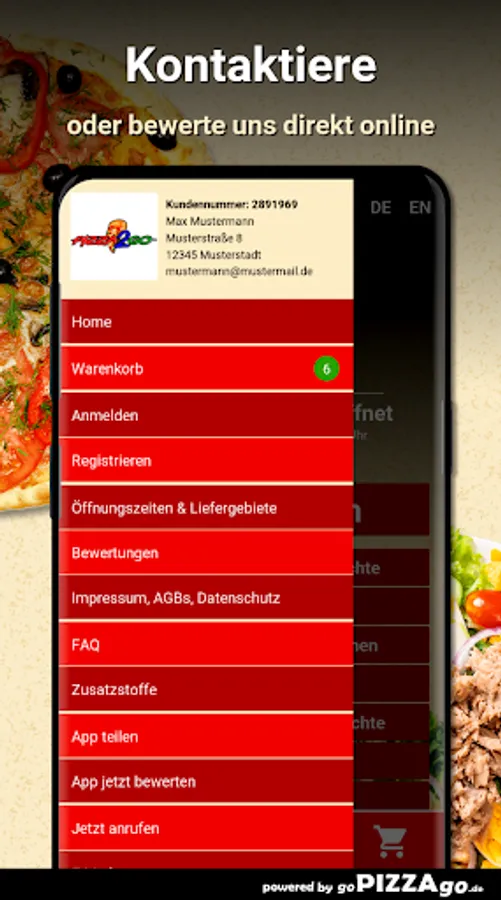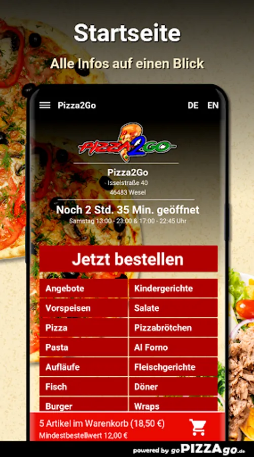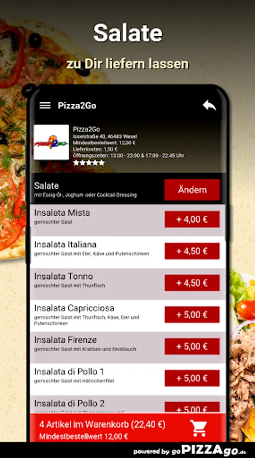 You can order many freshly prepared dishes quickly and securely online in our online shop with our Pizza2Go delivery service. We have 265 dishes such as Pizza Bolognese, Cocktail Dressing, Pizza Diavolo, Pizza Mimmo or Pizza Salmone for € 10.00