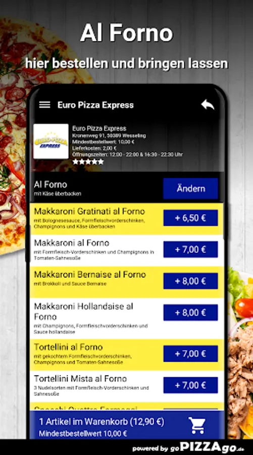 Would you like to have a delicious Italian meal today at Euro Pizza Express? The cuisine of Italy at Euro Pizza Express is very varied and simply delicious! Today you can choose from 68 dishes of the original Italian culinary art. Euro Pizza Express has gnocchi Bolognese with cream sauce for just € 7.00-9.50, you can get Pizza Italia delivered to your home for € 6.50-9.50, excellent Prosciutto pizza with molded shoulder ham. The delivery service brings you Pizza Spinaci and really good Spaghetti Gamberetti at a price of 7.00-9.50 €. Enjoy delicious food at Euro Pizza Express!
