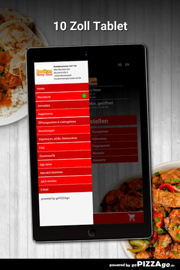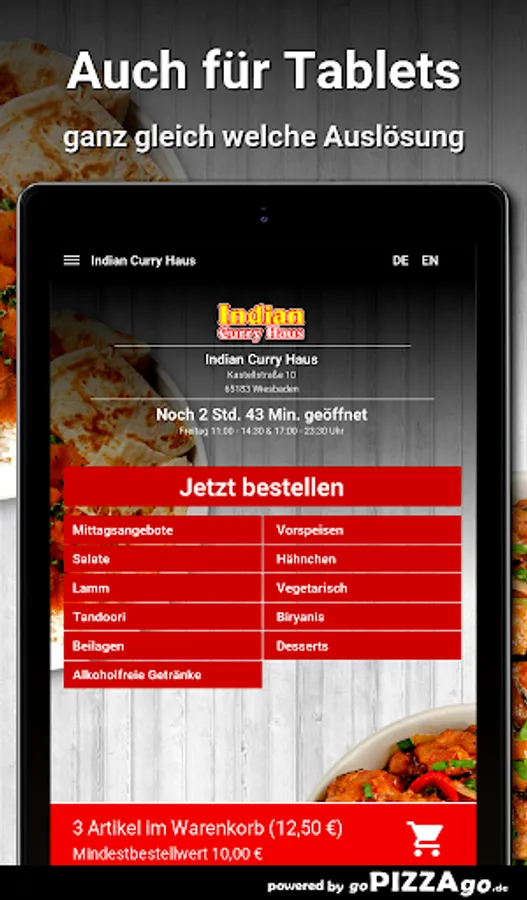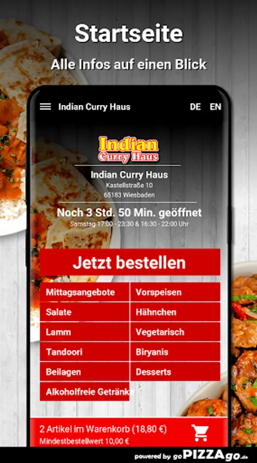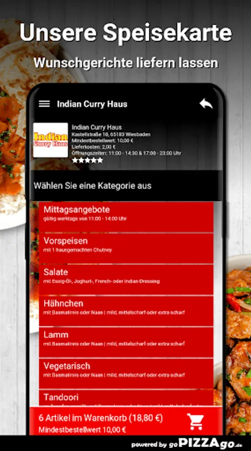 You can order fresh food quickly and securely online from the Indian Curry Haus delivery service (65183 Wiesbaden). A range of 114 delicacies awaits you, including 3 Papadam, Chicken Palak, Chicken Gobhi, Chicken Madras, Chicken Curry. For lunch we also have 1 vegetarian dish (EUR 9.90), 3 Indian dishes (€ 35.70), and 1 lamb dish (EUR 11.90) on offer. You can order delicious top-seller food at these times