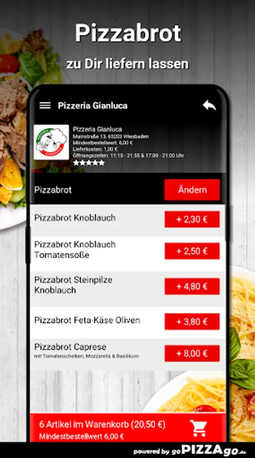 Enjoy pizza from Pizzeria Gianluca Wiesbaden like a gourmet65. Pizzeria Gianluca has the most exquisite pizzas for you: Pizza Yüksel, Pizza Tonno for delivery, Pizza Rucola can be delivered to your place of residence for 6.00 to 18.80 €, Pizza Francesca is available for 5, 00-15.90 €. You can get Pizza Beatrice, Pizza Gianluca at Pizzeria Gianluca for € 6.90-19.90.
