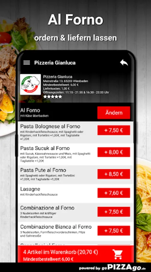 Enjoy delicious casseroles in a wide variety of creations at Pizzeria Gianluca Wiesbaden. Pizzeria Gianluca offers you 13 deliciously baked dishes online. You can get Combinazione Bianca al Forno at Pizzeria Gianluca for € 7.80, you can get cauliflower and potato casserole chicken, pasta Bolognese al Forno, cauliflower and potato casserole, salmon wherever you want, potato casserole, lasagna for 7.60 euros & Taglitatelle al Forno brings you the delivery service at a price of 8.90 €.