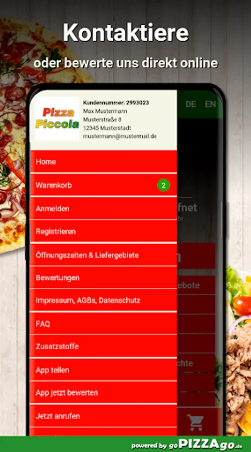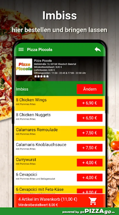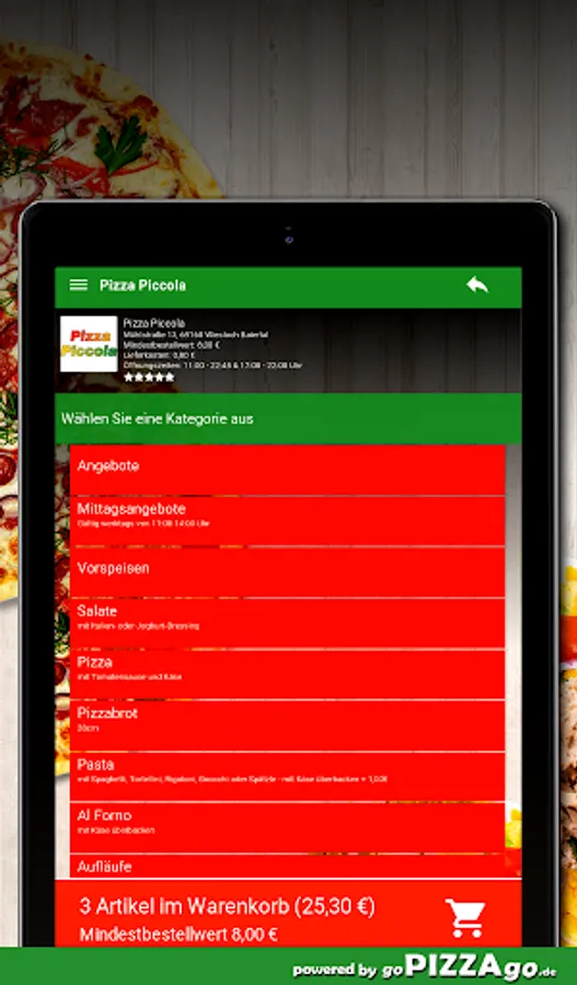 You can order a lot of food and drinks in our online shop at our pizza home service Pizza Piccola here. Your range of delicacies includes 155 foods such as cauliflower casserole, tomato sauce, pasta marinara, pasta aglio olio. Also order drinks: Sprite, Fanta, Coca-Cola. Or our lunch specials such as Friday Indian, Monday pizza, Thursday schnitzel, Wednesday pasta dish, Tuesday pizza.What do customers find most delicious? We deliver at these times