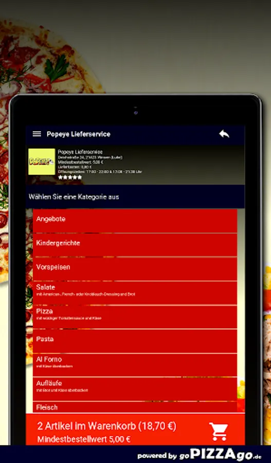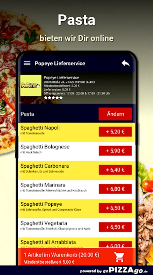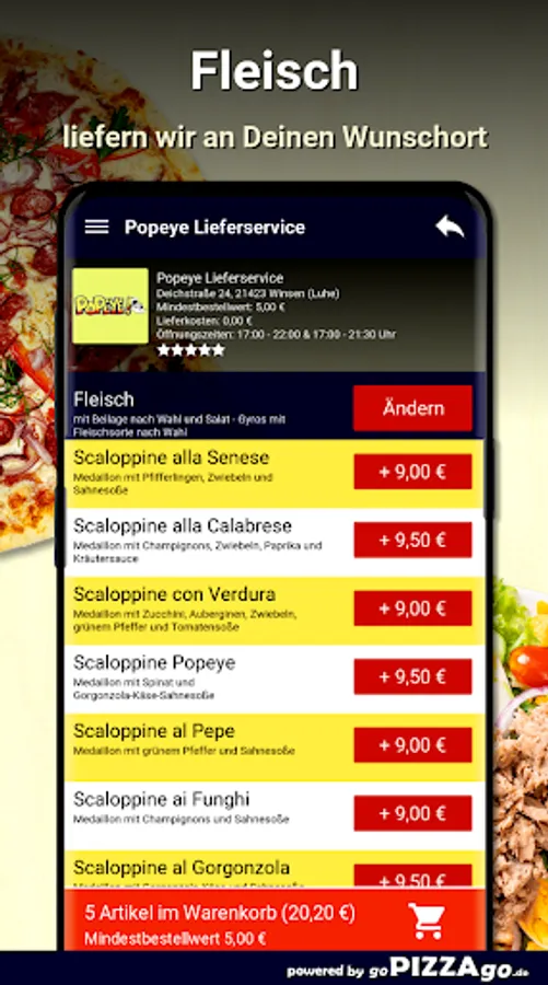 In Winsen (Luhe) you are in the mood for crispy pizzas from Popeye delivery service? You can easily order 30 pizzas online with your friends at Popeye delivery service. Pizza Calzone Gyros is available for € 7.50-9.00.