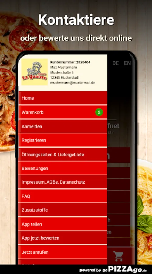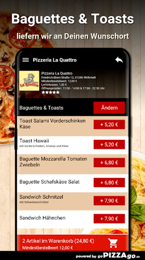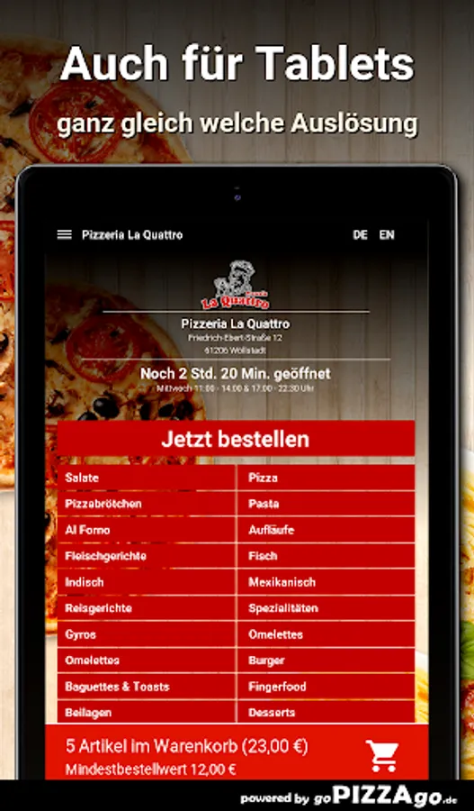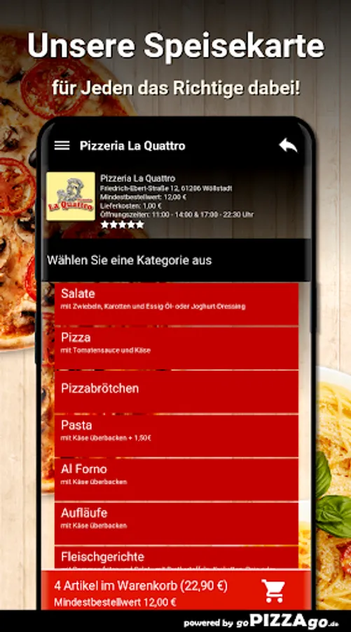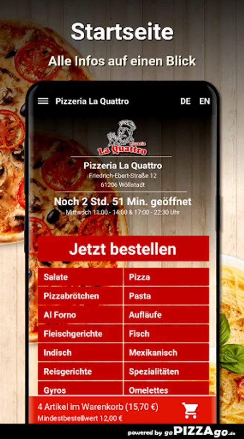 At Pizzeria La Quattro you can definitely order meat dishes, pizza, specialties, Mexican, fish, baguettes & toasts, burgers online.