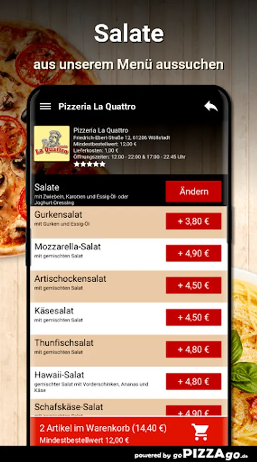 Order really healthy foods online in Wöllstadt: We have fresh and good salads as well: 28 salad dishes are available here, and there is sure to be something crunchy for you. Seafood salad is brought to you for € 9.00, cheese salad, crispy capricciosa salad is available for € 5.00-7.50, fresh and young sheep's cheese salad € 4.90-7.20, turkey meat salad brings you the home service at a price of € 8.50 to the delivery location of your choice, shrimp salad with mixed salad directly to you, fresh and young mozzarella salad, young and crunchy Italia salad 5.90-7.50 euros, artichoke salad it costs € 4.50 to € 6.50, and a crisp, fresh mista salad costs € 4.00-6.00.