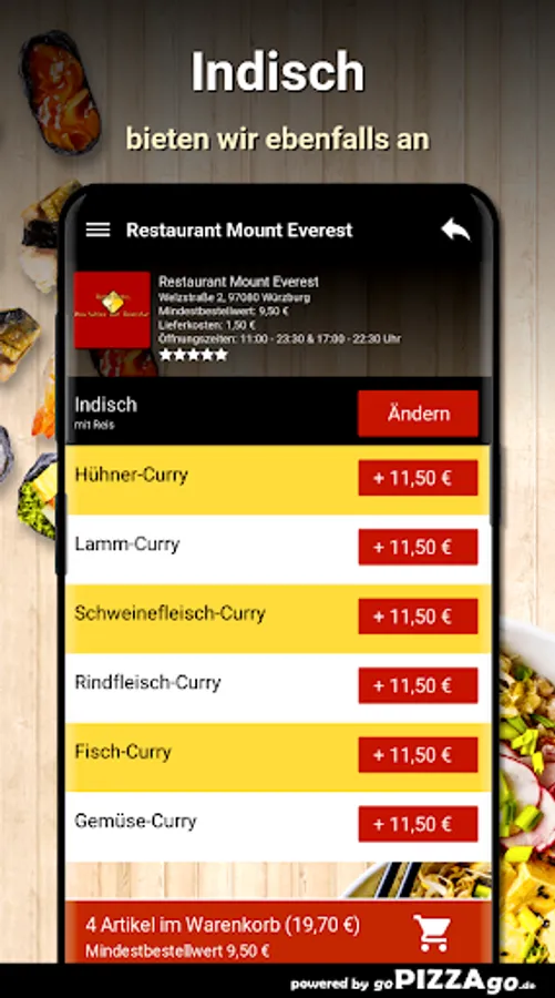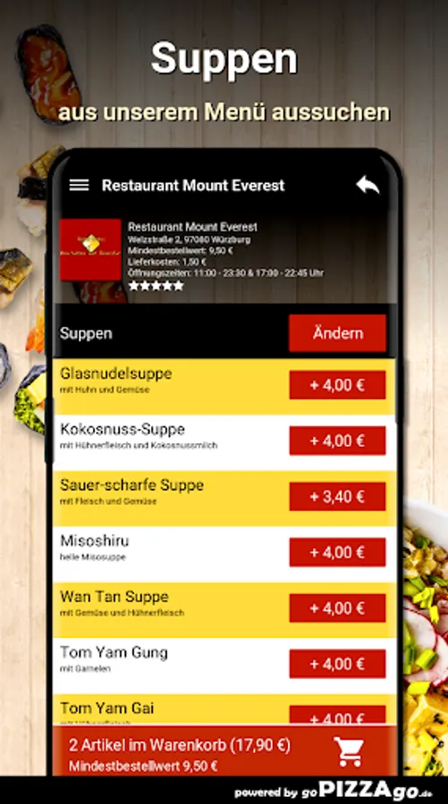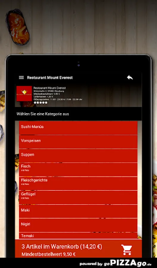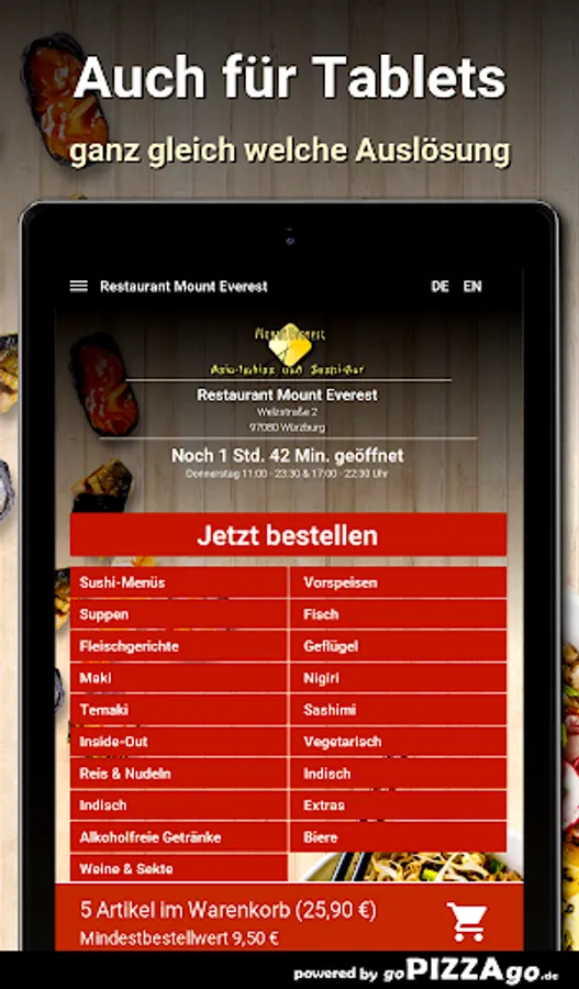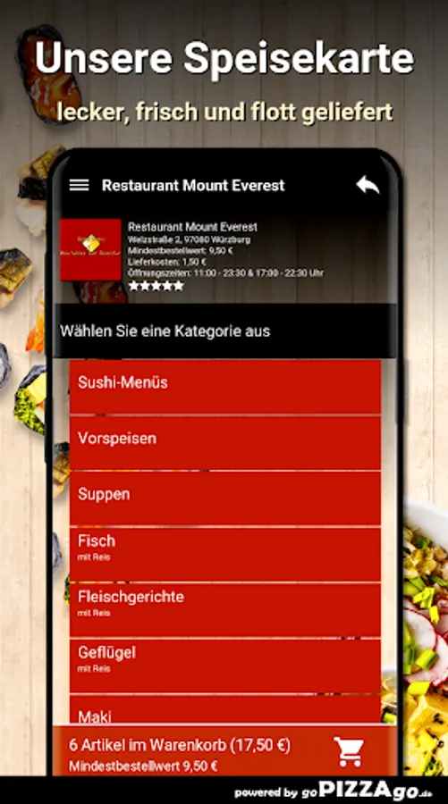 Wohlschmeckend mundendes Essen können Sie auf dieser Homepage bei unserem Lieferservice Restaurant Mount Everest in Würzburg bestellen und in Dein Zuhause oder vielleicht auch das Büro liefern lassen. Unsere aktuelle Speisekarte hat 140 genussvolle Speisen wie Maguro Sashimi, Chana Masala, Rindfleisch-Curry oder auch FC Bayern Maki für 13,00 Euro. Zusätzlich kannst Du alkoholfreie Getränke wie Mirinda, 7 Up, Kokosnuss Saft ordern.Bei uns wird am meisten dies bestelltWann wir liefern?