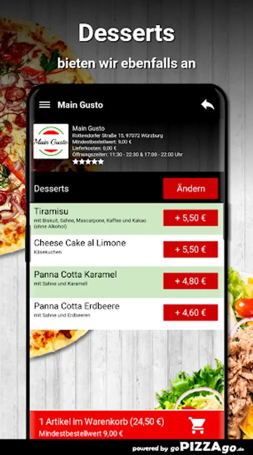 You can order and pay for a lot of food and drinks online with our Main Gusto delivery service. Of course we offer you 65 delicacies. For dessert, we recommend tiramisu, cheese cake al lime, panna cotta strawberry, panna cotta caramel. Customers find the following specialties best. You can order food at these times