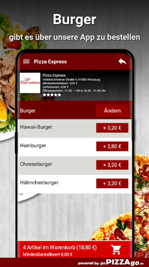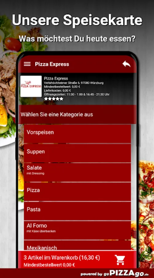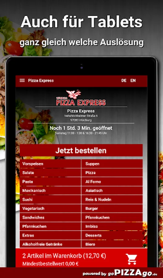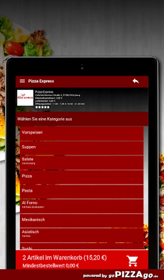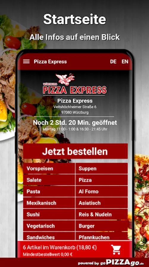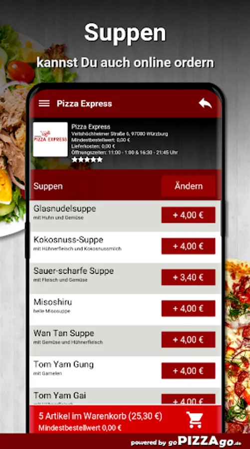 You can order meals, freshly prepared and delivered hot, from the home service Pizza Express (Veitshöchheimer Straße 6 in Würzburg) online and have them delivered promptly. Choose from our menu from 236 feasts (Gäng Kio Wan Gung, pizza minced meat mushrooms, crispy duck with vegetables, 2 nigiri saba, 2 nigiri amaebi, small sashimimori, mixed salad, chicken in coconut sauce or vegetable curry for 9.00 euros) . On top of that you can of course order drinks such as green tea, seven up, orange juice, lychee juice, Schwip Schwap