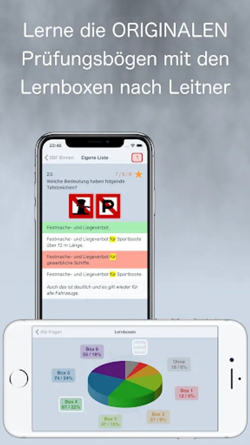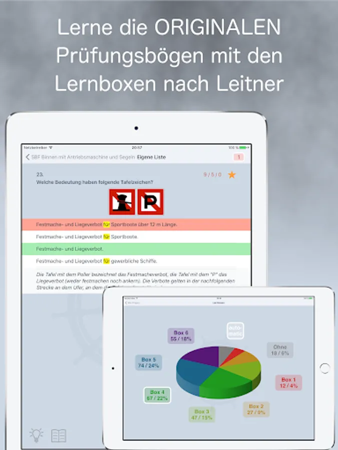 Successfully to the SBF Binnen through intelligent learning systems (Leitner, learning mode "Uncertain questions" :-) textbook :-) multiple choice tips ... clever sorting out of the answers :-) deletion of unexamined questions :-) all nodes of the exam