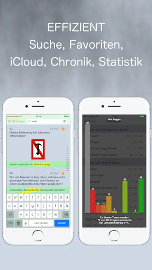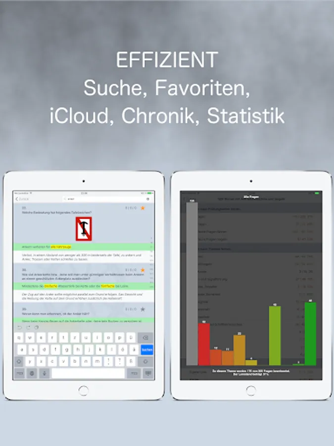 • The graphic STATISTICS and short statistics show you the learning status of individual questions, the questionnaires or entire topics at any time. Colored if you want. Red - you have to do it again... Green - that's it. So you always know where you stand.