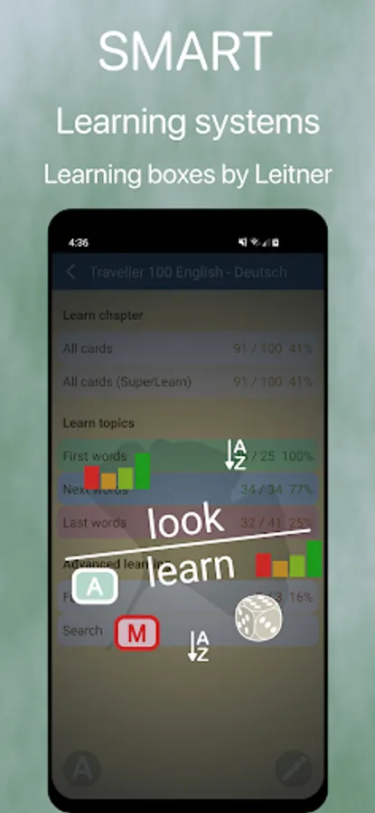 SuperLearn is optimized for learning languages while traveling. With SuperLearn sorting, you start with the simple/important cards you need immediately in a new country ('hello', 'good bye', ...) and build up your vocabulary as you go. If you miss a vocabulary word, you can easily add a new card and learn it immediately with your learning boxes.
