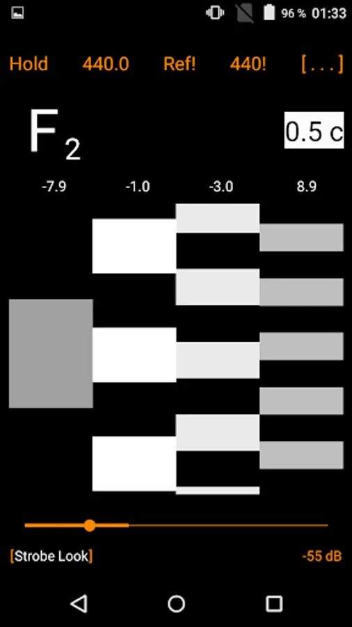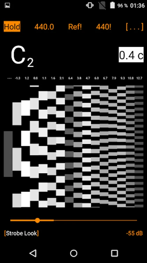 Harmonic Tuner Strobe Look does not implement the conventional strobe tuner principle, but offers a similar appearance of moving patterns. While typical mechanical strobe tuners show detuning of octave harmonics only, Harmonic Tuner Strobe Look shows the detuning even of non-octave harmonics.