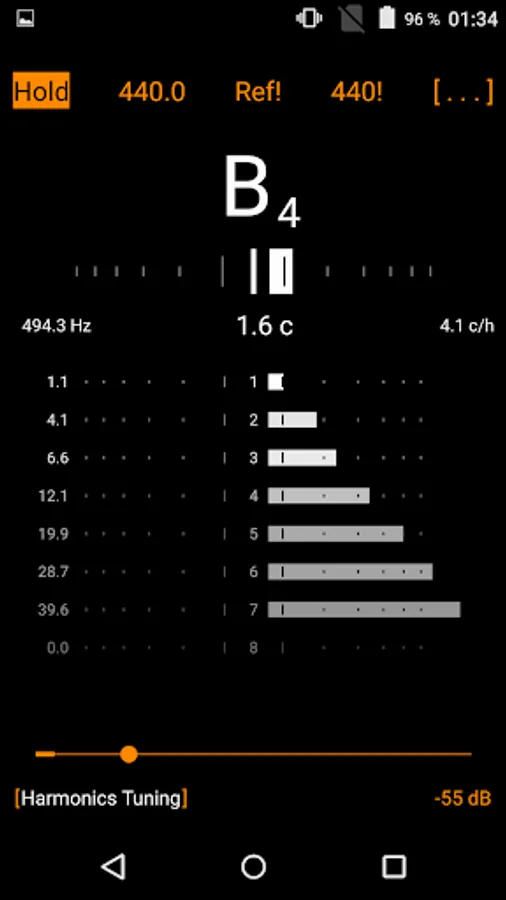 Harmonic components especially at stringed instruments like guitars, basses,pianos are always detuned. Up to 16 note's harmonics can be displayed individually in an intuitive and precise strobe tuner look of adjustable sensitivity.