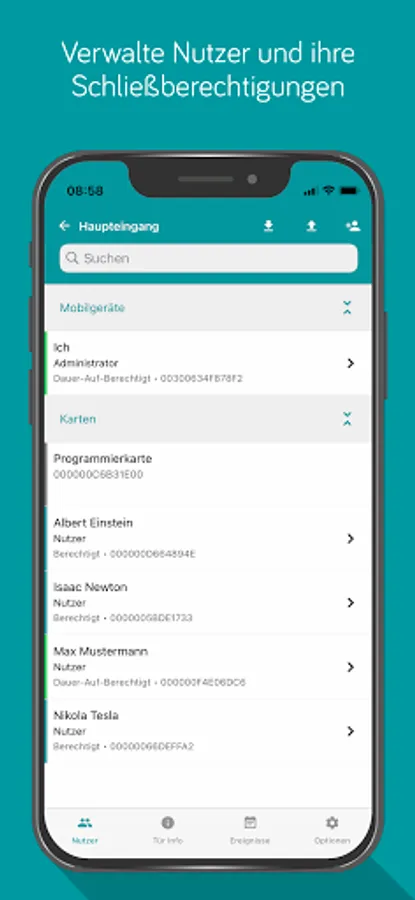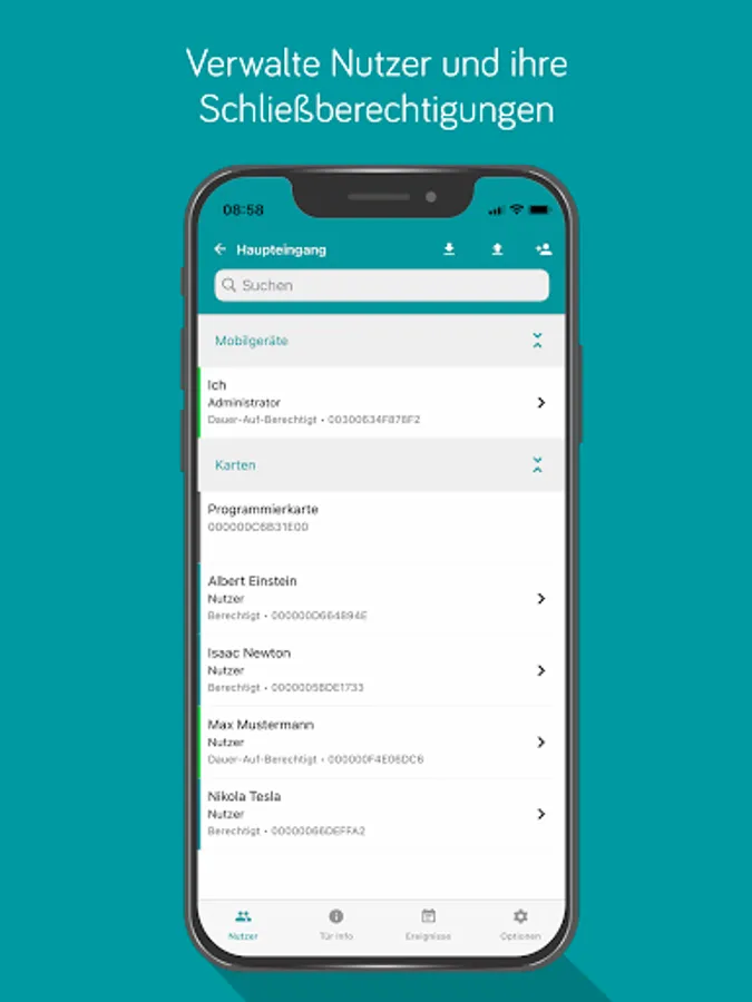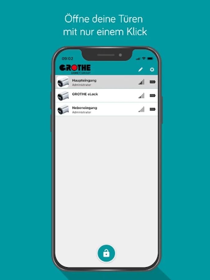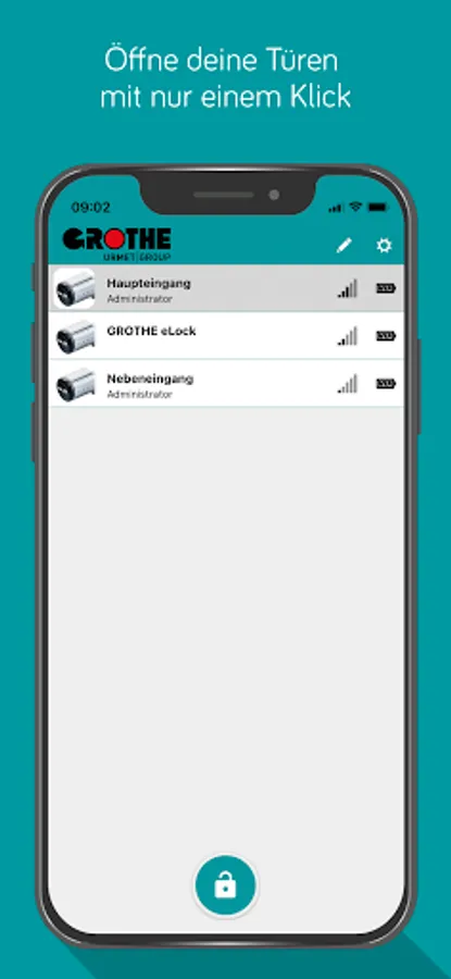 With the GROTHE eLockApp, the GROTHE eLock locking cylinders can be opened securely and conveniently managed. Each user can be assigned access authorizations, which are encrypted and transmitted to the locking cylinder via Bluetooth when trying to open the door. There they are cross-checked and, if authorized, the cylinder knob is activated for operation. The app is fully functional offline.