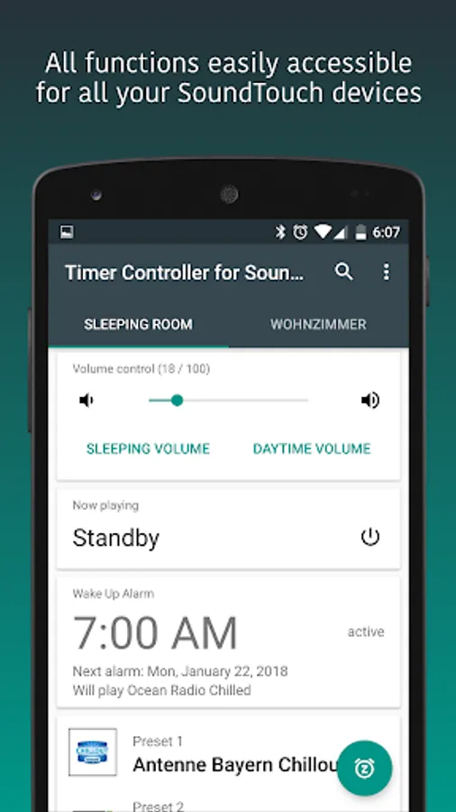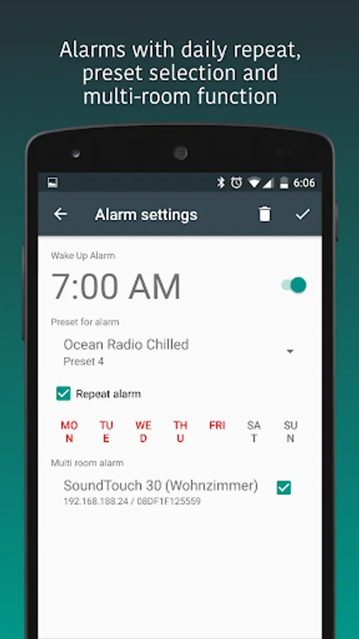 You can also create a wake up alarm and wake up with your favorite radio station. A special preset can be selected for the alarm as well a multi-room alarm for all your SoundTouch devices.