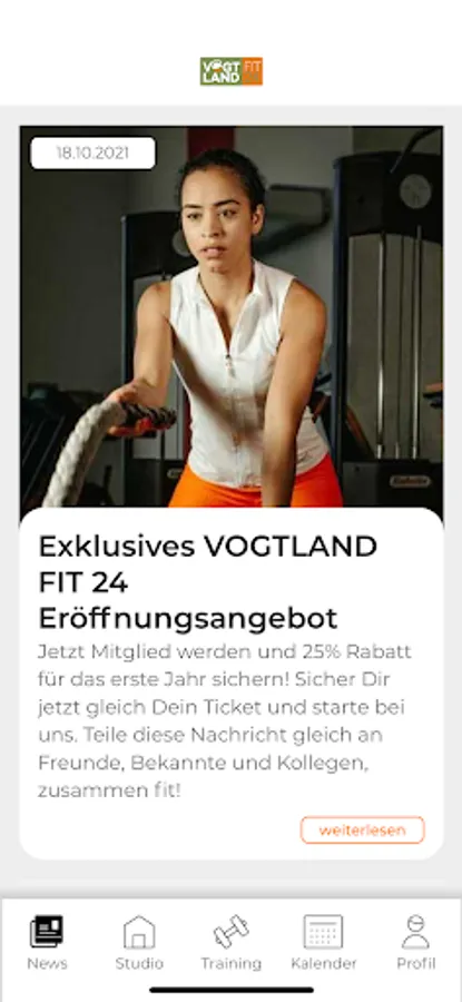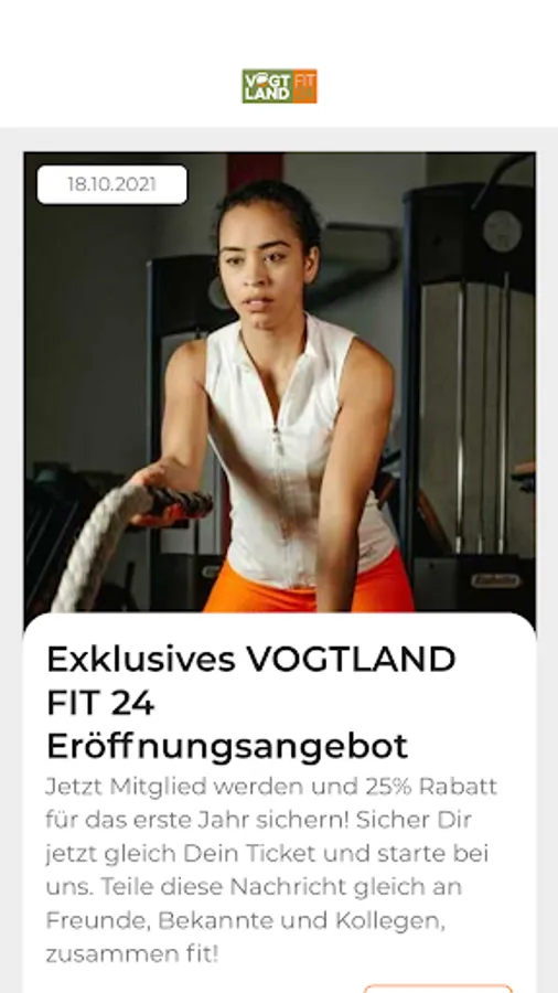 You will receive the most important news and updates of your VOGTLAND FIT 24 as easily and directly as possible. Special opening times, new employees, exercises of the week or limited studio offers - you will always stay up to date. In addition, the news items can be accessed quickly and easily forward the friends directly from the app.