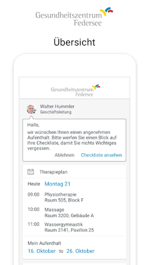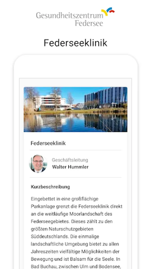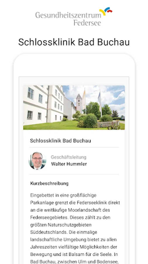 The rehabilitation clinics of the Gesundheitszentrum Federsee in Bad Buchau (Schlossklinik and Federseeklinik) also accompany you digitally before, during and after your rehabilitation.Benefit from all the advantages of the App:
