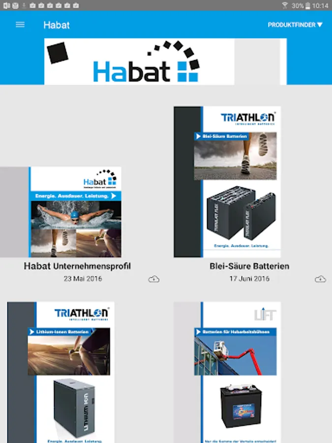 With the app of Habat GmbH is available in addition to information on the company, the complete overview of all brochures, sales materials, brochures, etc. to the individual battery categories. Broken down by subject area, you can download your product - fast and free.