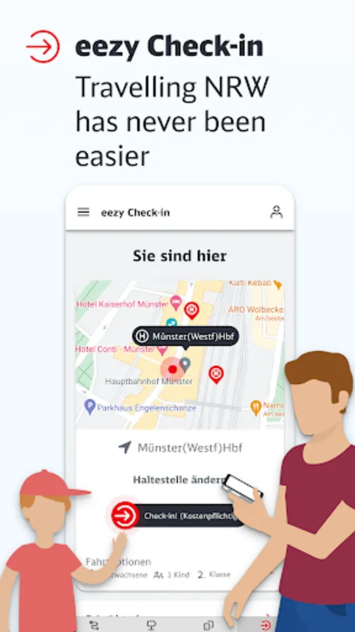 Ticket NRW eezy Check-in makes traveling fast and easy. With our check-in/check-out procedure, you travel spontaneously, flexibly and, above all, easily in all eezy eTariffs in NRW (eezy.nrw, eezy.avv, eezy.vrr, eezy.vrs and eezy.westfalen). One swipe and you can start driving. We automatically detect the end of your journey and calculate the lowest price in the eezy eTarif world.