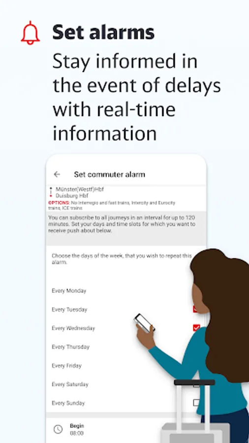 If you regularly travel by train, you no doubt like to have the latest information about an upcoming journey. The alarm function sends you push notifications with the details of delays, cancellations and service disruptions. Our system can send you information about disruptions for a specific service or for a number of trains using the same route. To ensure that you can plan your journey properly, you will receive messages until the disruption is resolved. You can click the pause button to stop the alarm function.