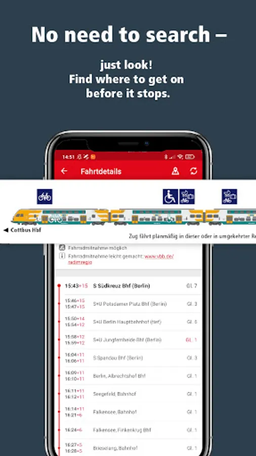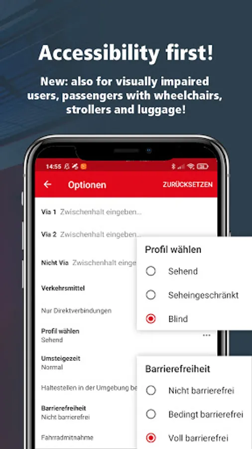 - Travel with no barriers: Timetable information and route calculations now come with special search options for blind and visually impaired passengers