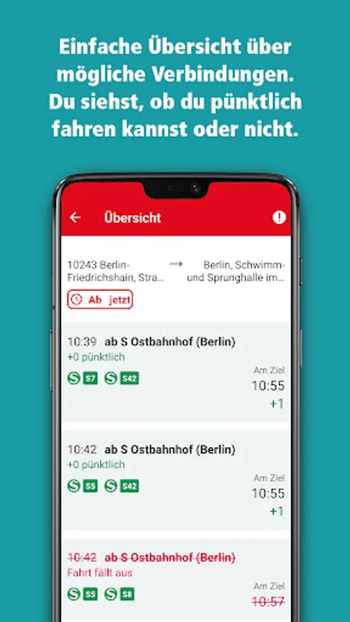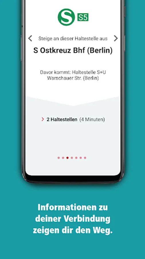 Step-by-step information during the journey, for example: get on S3 in the direction of S Erkner Bhf; S3 arrives: 13:15 (+0) on Pl. 1