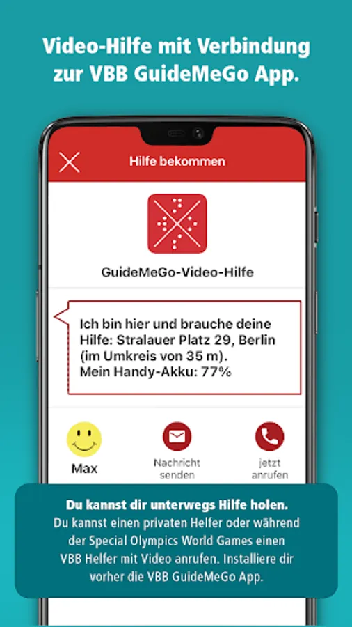 For more help, open the VBB GuideMeGo app, make video calls and show the helper your surroundings (must be installed in advance)