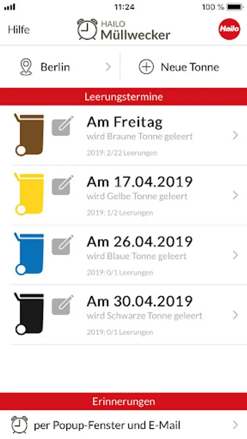Never forget garbage collection appointments. An automatic garbage alarm clock always informs you in advance which of the many different tons - whether blue, green, black, brown or yellow - must be ready for emptying. Also special features such as "electrical waste", "branch cut" or "bulky waste" can be detected.