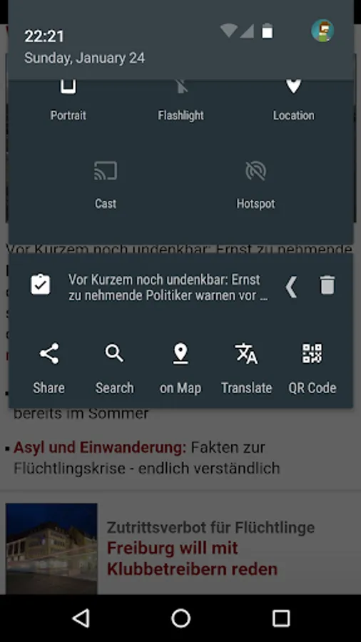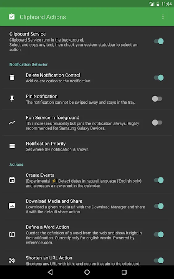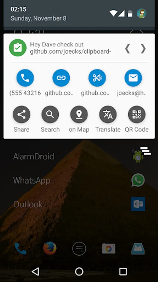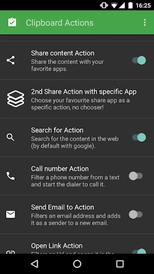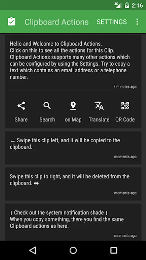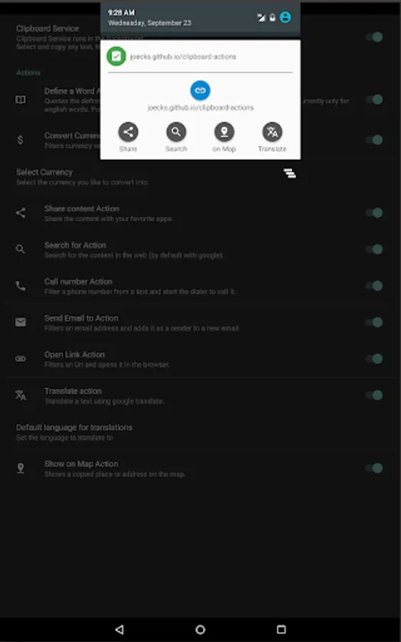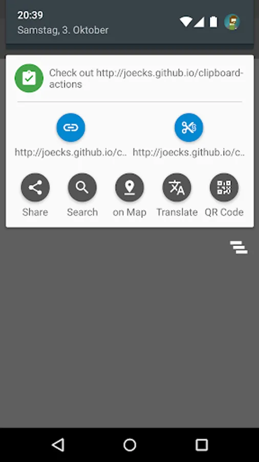 Clipboard Actions creates actions based on your copied text shows them in the status bar as notification or in a nice list in the App, where you can manage your clips.
