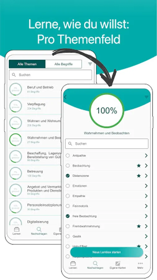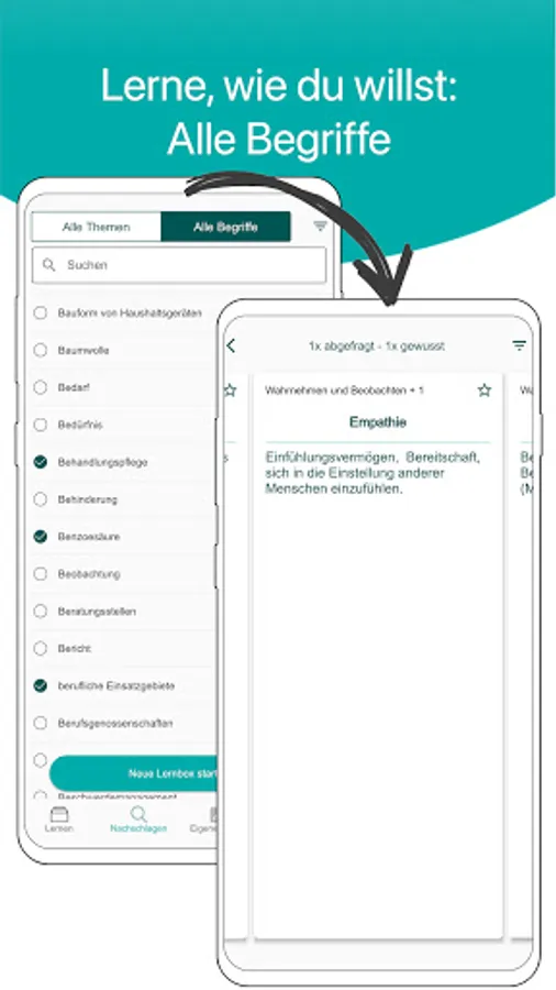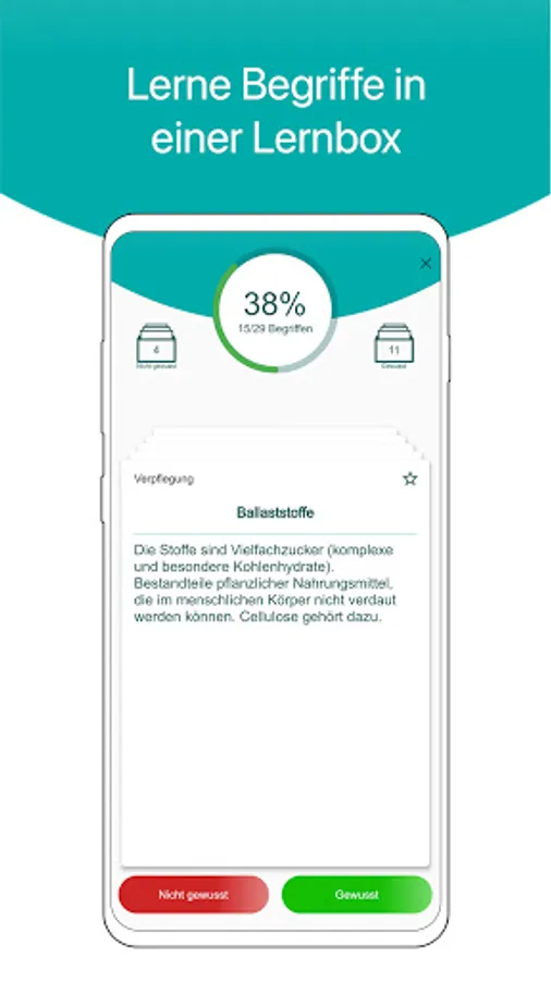 With the LernBOX, you learn successfully because your personal knowledge is taken into account. Terms that you don't know yet are repeated more often than those that you already know well.
