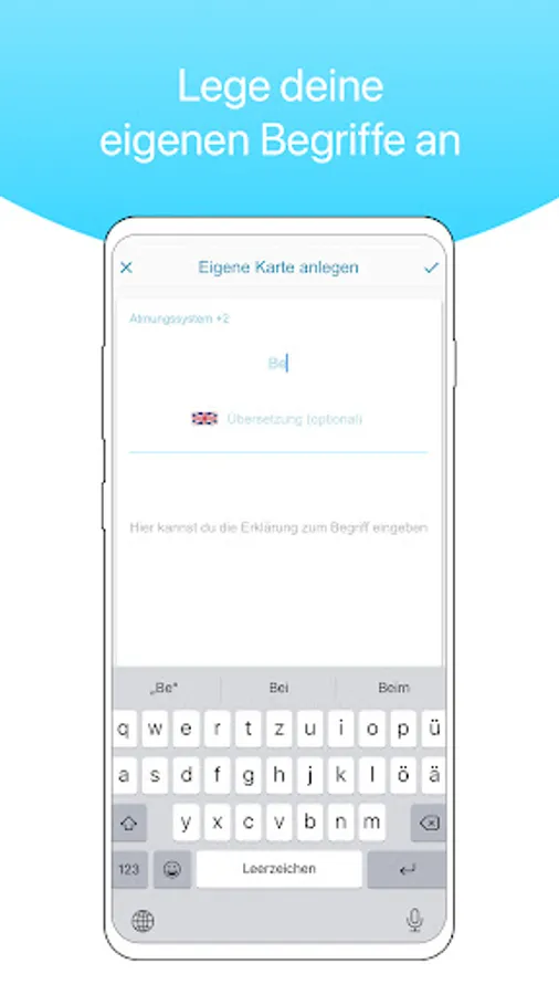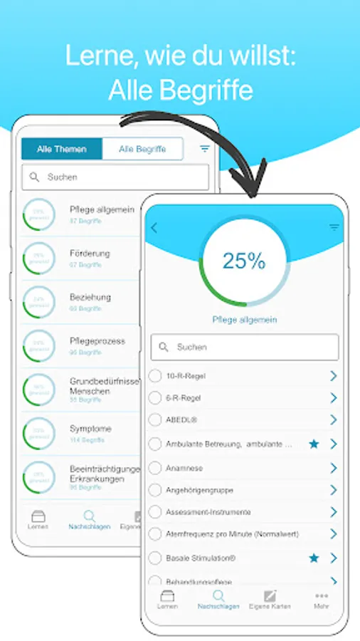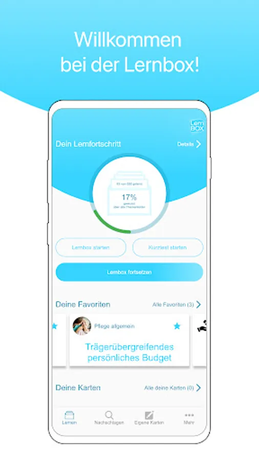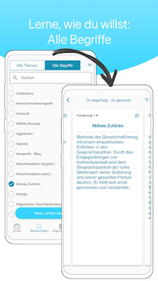The LernBOX HEP is a specialist term trainer and includes over 500 of the most important terms for training as a curative educational nurse. The content is divided into 26 subject areas. So you can learn to match the material that is currently being taught in school and internship, you can choose terms or learn about all existing terms. You can add your own terms to your LernBOX. Particularly important terms can be set as favorites.