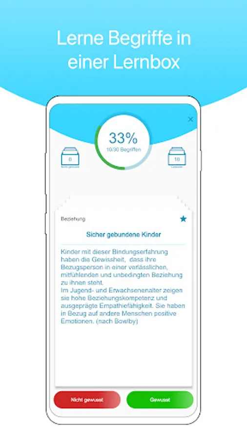 With the LernBOX you learn successfully because your personal knowledge is taken into account. Terms that you don't know yet are repeated more often than those that you already know well.