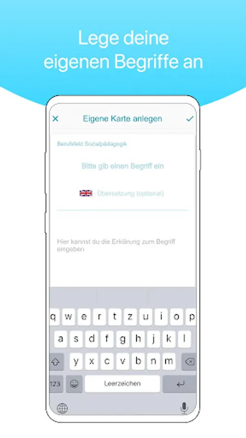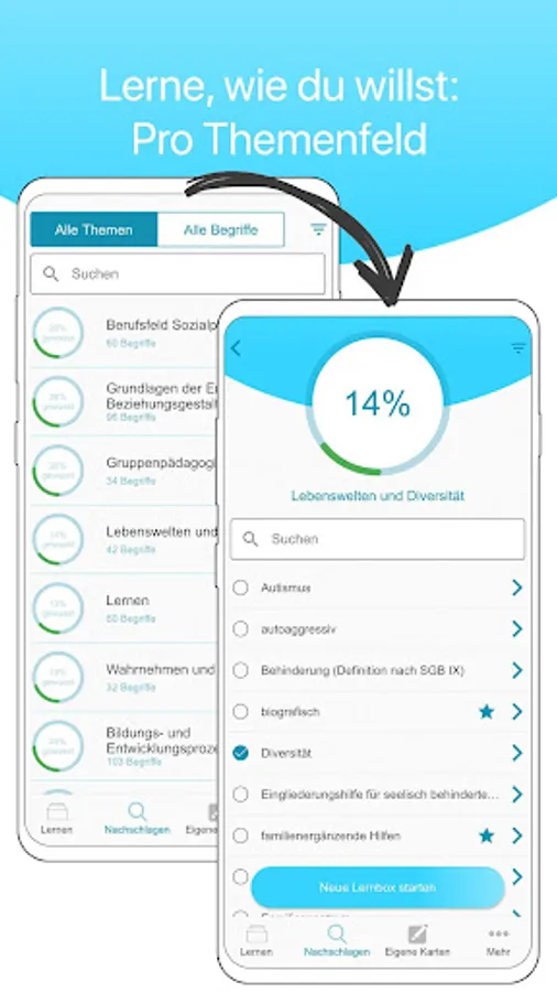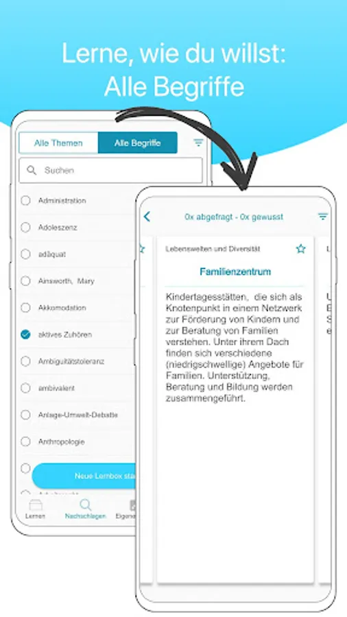 The LernBOX educator is a specialist term trainer and includes the most important 400 terms and concepts for training as an educator. The content is divided into 10 subject areas. So you can learn to match the subject that is currently in school and practice, you can choose terms or learn about all existing terms. You can add your own terms in your LernBOX. Particularly important terms can be set as favorites.