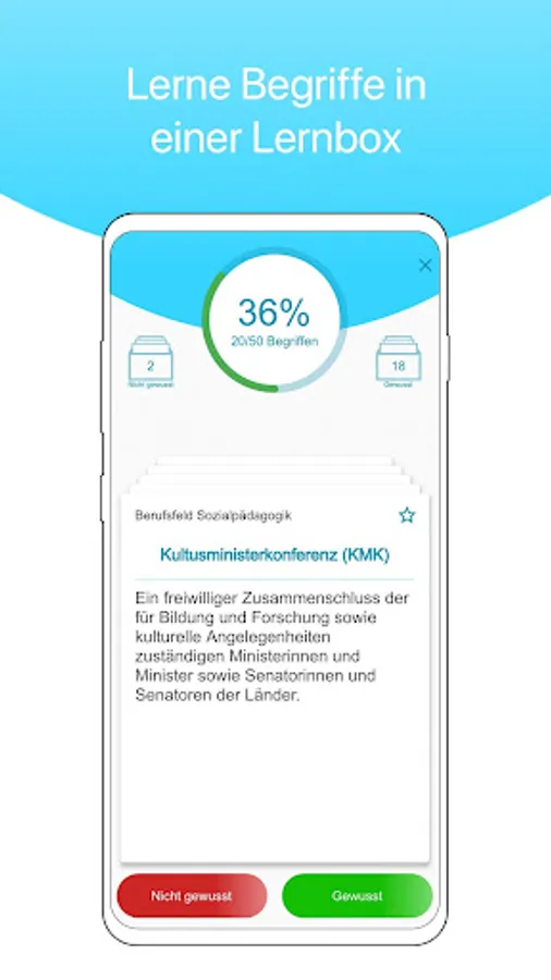 You learn successfully with the LernBOX because your personal knowledge is taken into account. Terms that you don't know yet are repeated more often than terms you already know well.