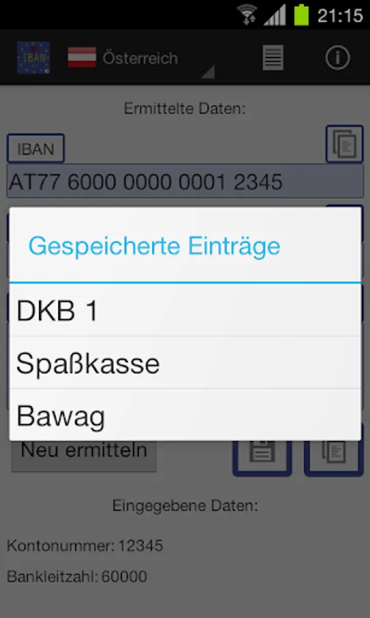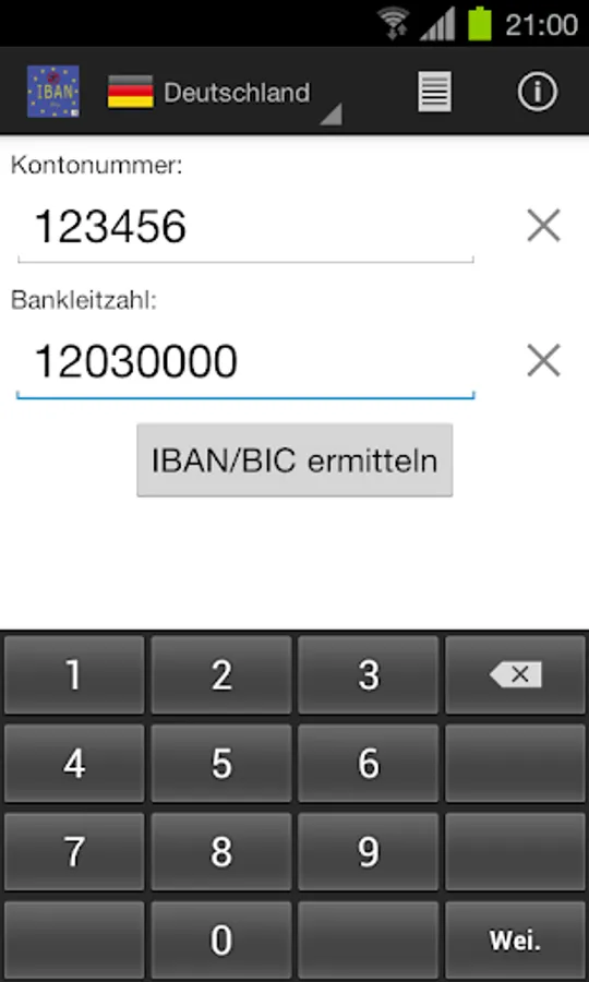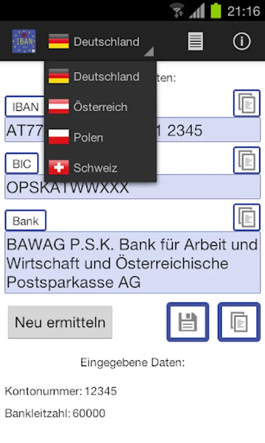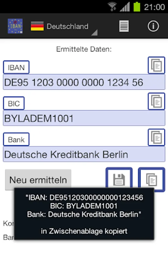 - copy-all-feature: calculated IBAN, BIC and name of the bank can be saved into the clipboard in one step