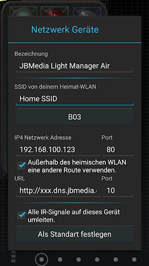 In order to be able to control the JBMedia Light Manager, it must already be set up completely and be accessible in the WLAN. Then you only have to enter the IP in RCoid and you can immediately assign all scenes or actuators to the remote control.