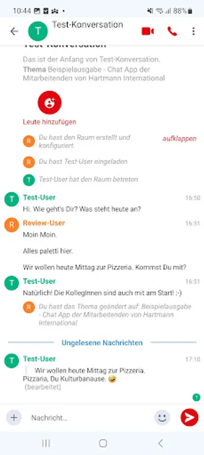 The chat app for legally compliant communication at Hartmann International. Whether it's a one-on-one or group chat, chat with your colleagues without revealing your private cell phone number. Send texts, images, videos and voice messages, share documents or start a video call. All data is only stored in the app and does not appear in your smartphone's gallery. The chat app hosted in Germany works on smartphones, tablets and PCs.