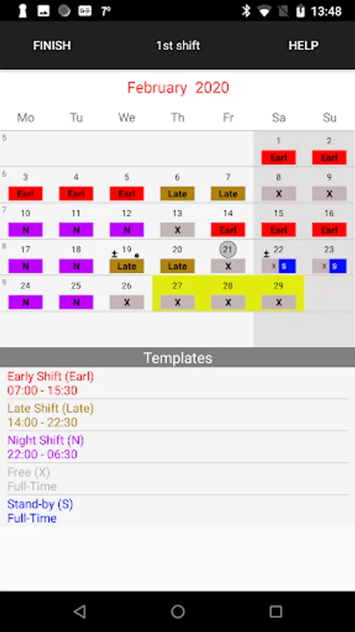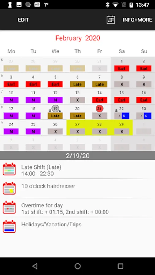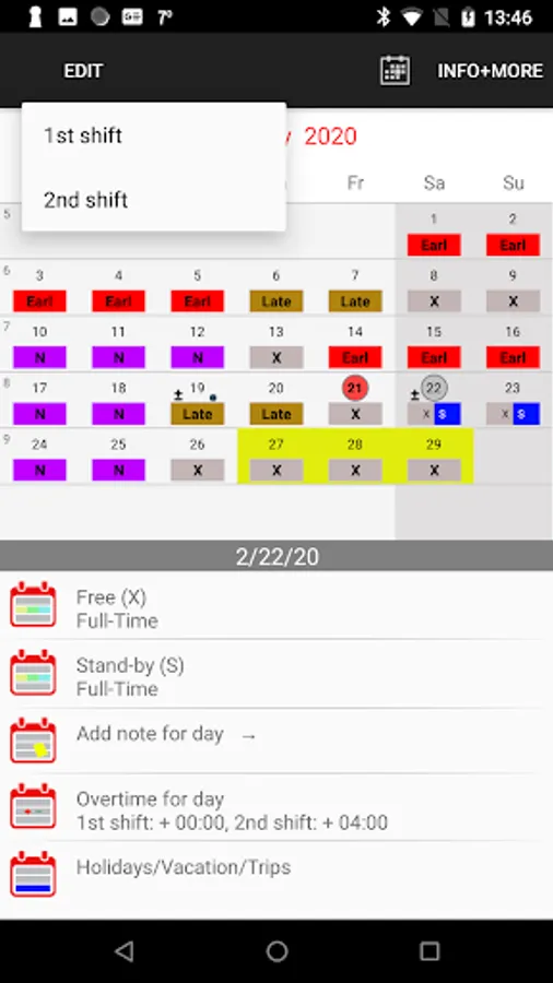 Just choose your shift, morning, regular or late and tap the corresponding day. You can define work times, colors, names and many more to fit your needs. With our unique app you can create your whole shift pattern in less than a minute. No app can beat this.