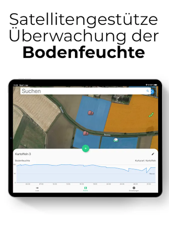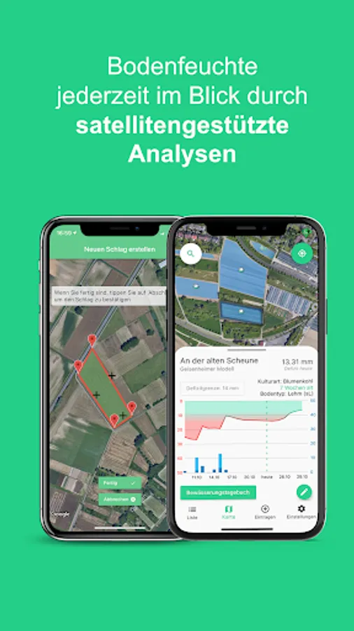 With WaterFox you get mobile soil moisture and agricultural weather information for your crops. The analysis of satellite images with the possibility to connect your own weather station achieves field-accurate irrigation suggestions. With the Geisenheim model, vegetable gardeners receive irrigation forecasts individually for their crop (from corn to potatoes to cut lettuce) and can thus optimize their cultivation. The artificial intelligence behind the analyses of satellite images and weather data works very accurately. Moisture measurements are now possible for the first time without additional equipment and associated maintenance. This is a decisive cost and effort advantage over conventional methods of soil moisture measurement. Rainfall forecasts are taken into account with field accuracy for the first time, increasing the reliability of recommendations. Desiccation warnings help prevent plant damage.