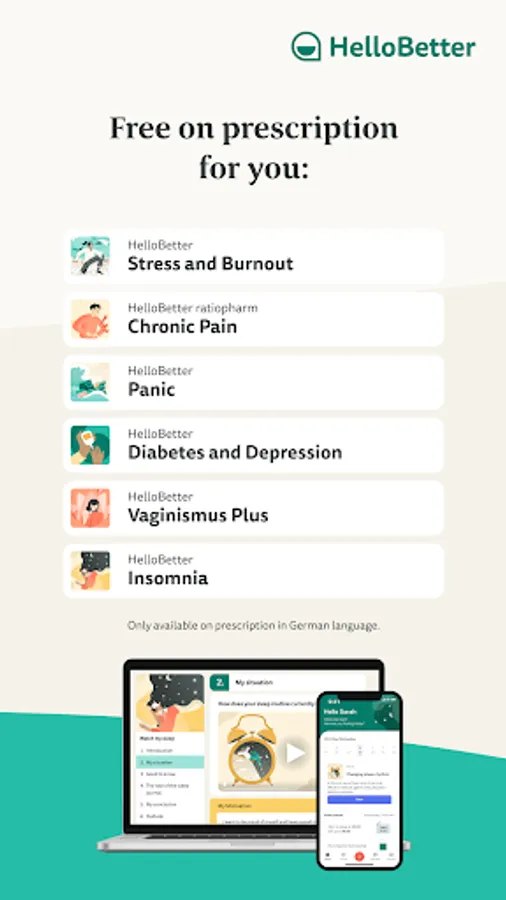 With HelloBetter, you get effective psychological support - without waiting time, and free of charge on prescription. Psychological support - no matter where you are? You can get it with the HelloBetter app. Developed by psychologists and psychotherapists.