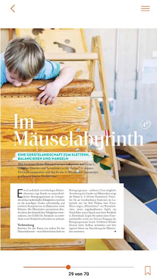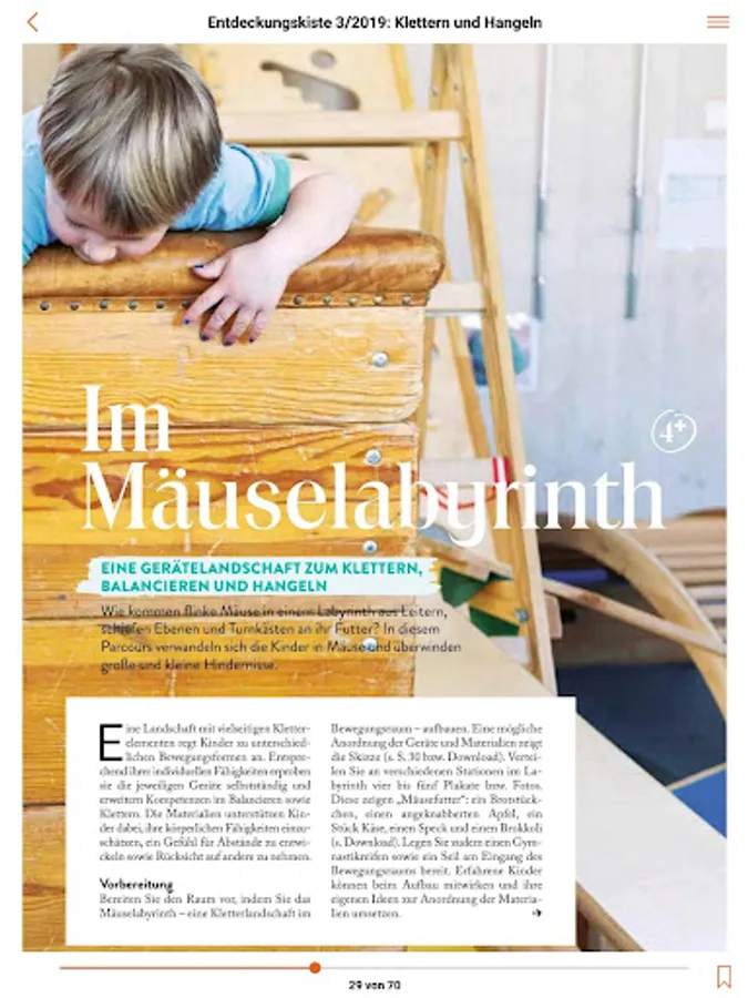 Each issue contains a new education or project topic. On this subject you will receive a lot of practice material such. As movement games, experiments, design and craft ideas, songs, relaxation stories, poetry and hands-on stories and much more. Also included: impulses for your work in the crèche and seasonal practical ideas for spring, summer, autumn and winter. There are background information and project reports from the field. A firework of ideas!