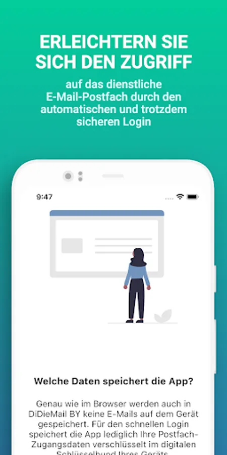 Just like in the browser, no emails are saved on the device in the DiDieMail BY app. To speed up your login, the app saves your mailbox access data locally on your device. This happens with a secure SHA-256 encryption. Of course, this data is only stored on your device and is not transferred anywhere. The app also dispenses with the transmission of user statistics and other user data. So the developer does not collect any data at all.