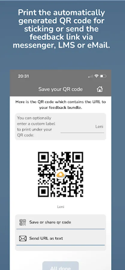 > Share: After uploading, you can save and print an automatically generated QR code to stick on the student's work. If you communicate with the student via school messenger or LMS, simply send the text link to the feedback.