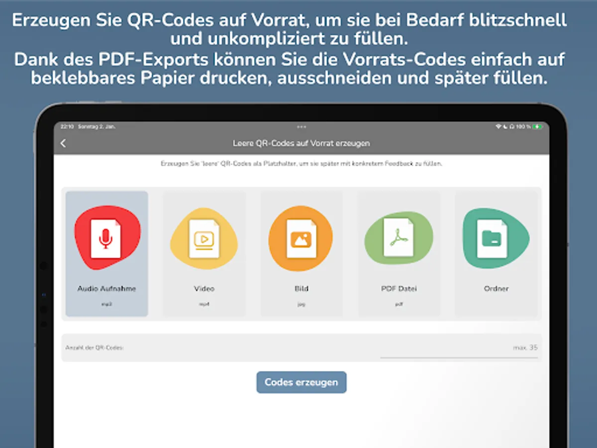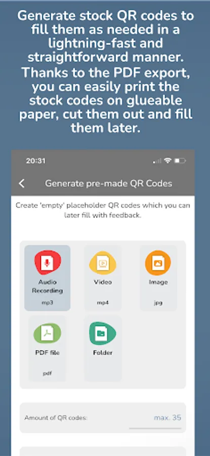 You can generate up to 30 placeholder QR codes at once for all possible feedback types directly in hyfee and save them in a PDF file. This way you can print the codes collected on one page, cut them out and keep them in stock.
