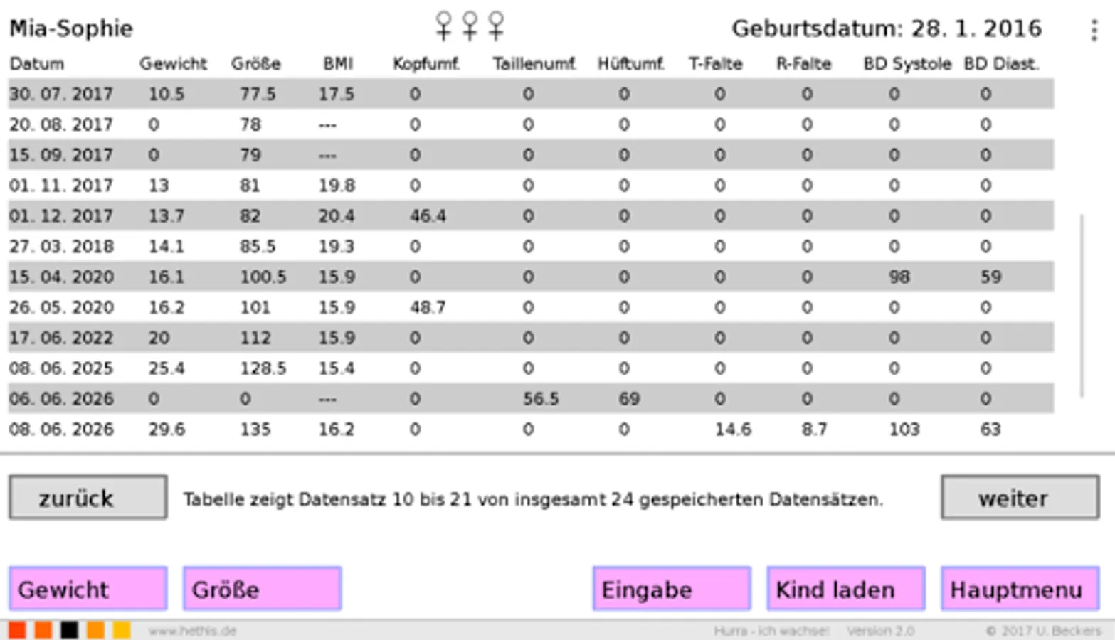 With this app you an record measures for body height, weight, the body mass index (BMI), head girth, waist and hip circumferences, skinfolds, body fat and blood pressure, display them graphically and compare them against reference data by the RKI. BMI and body fat percentages get calculated automatically.