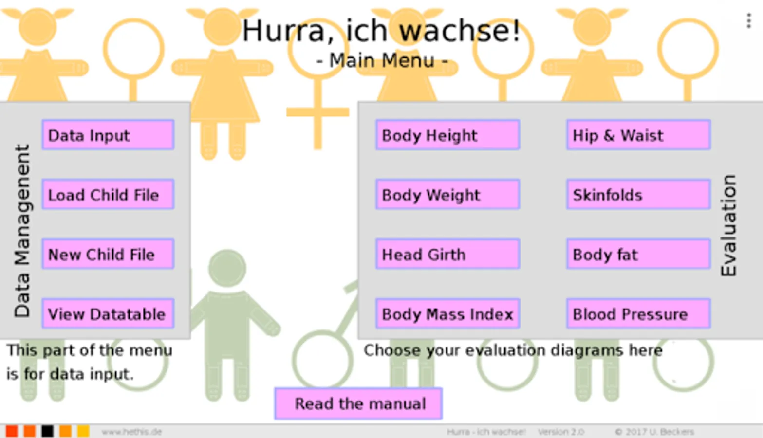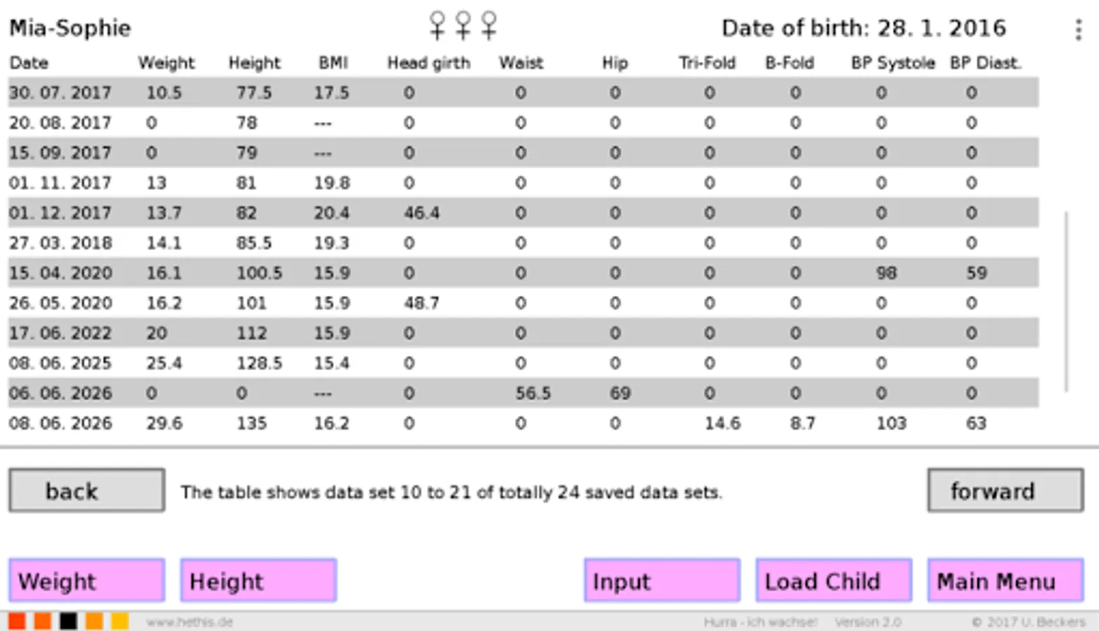 With this app you an record measures for body height, weight, the body mass index (BMI), head girth, waist and hip circumferences, skinfolds, body fat and blood pressure, display them graphically and compare them against reference data by the RKI. BMI and body fat percentages get calculated automatically.