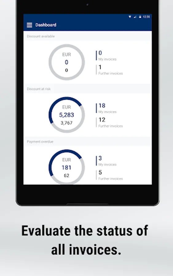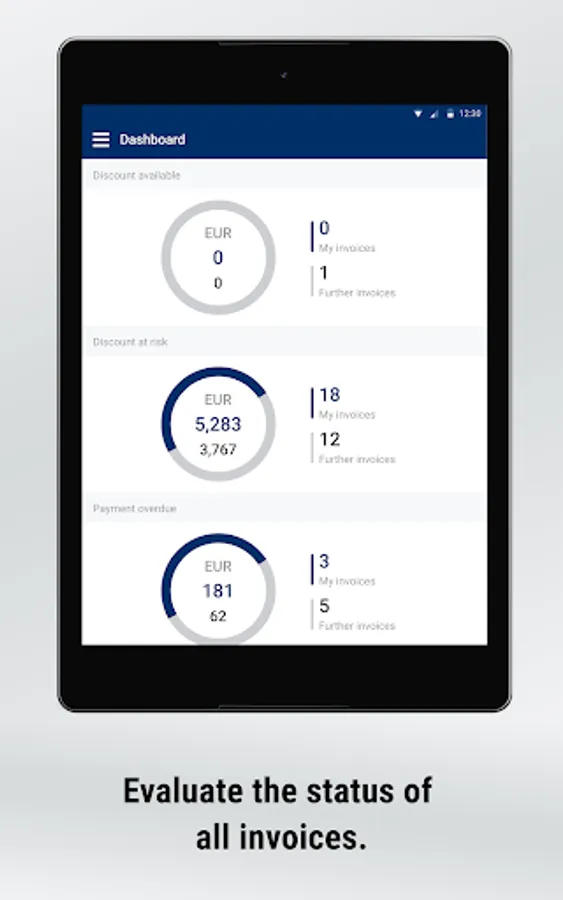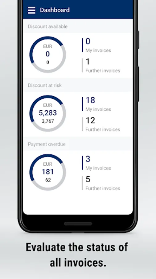 • personal dashboard with warnings: invoices and receipts overdue, imminent cash discount losses, price increases