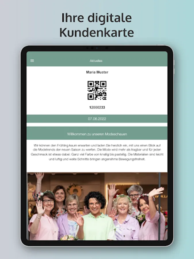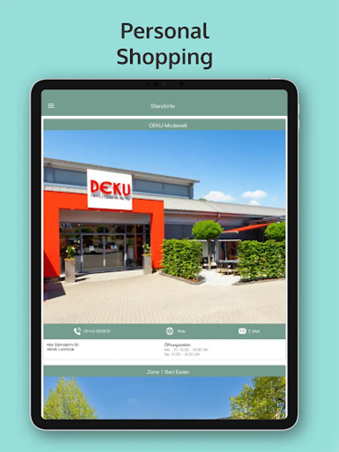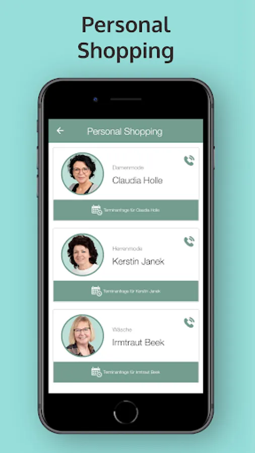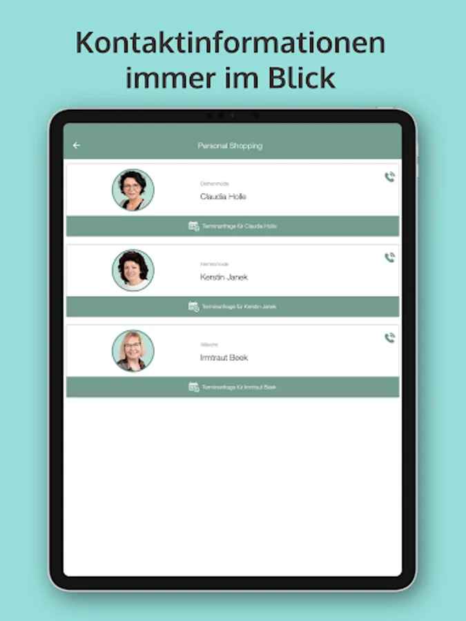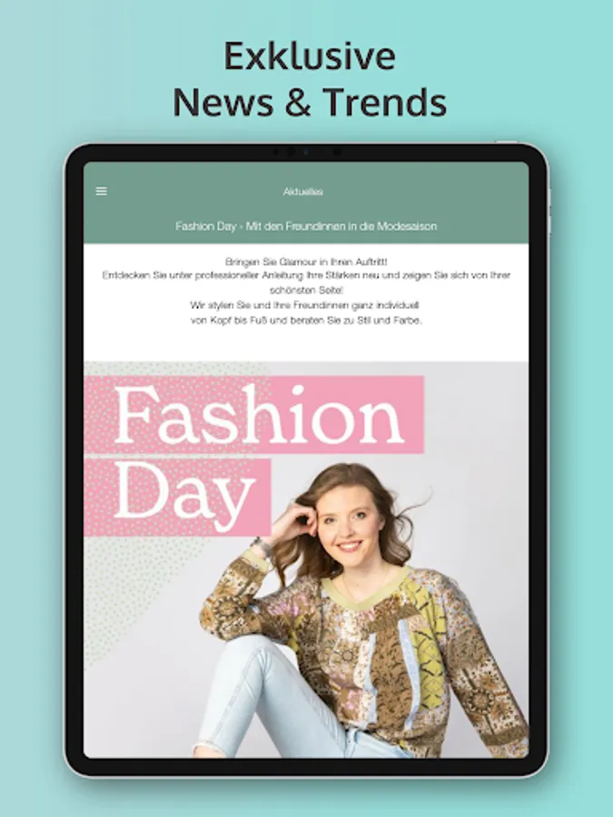 • Personal Shopping: With us you are always up to date. We accompany you competently and stylishly right from the start. Simply arrange a consultation appointment with the fashion consultant of your choice in your app.