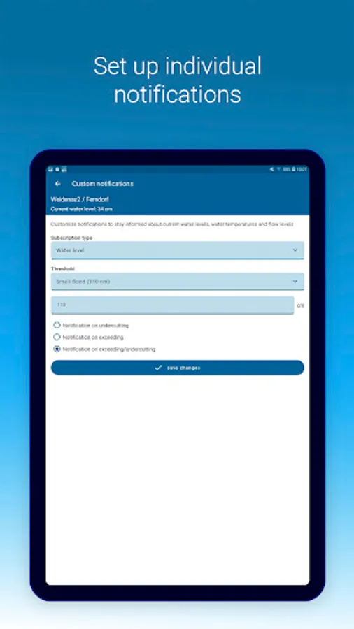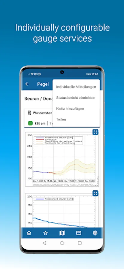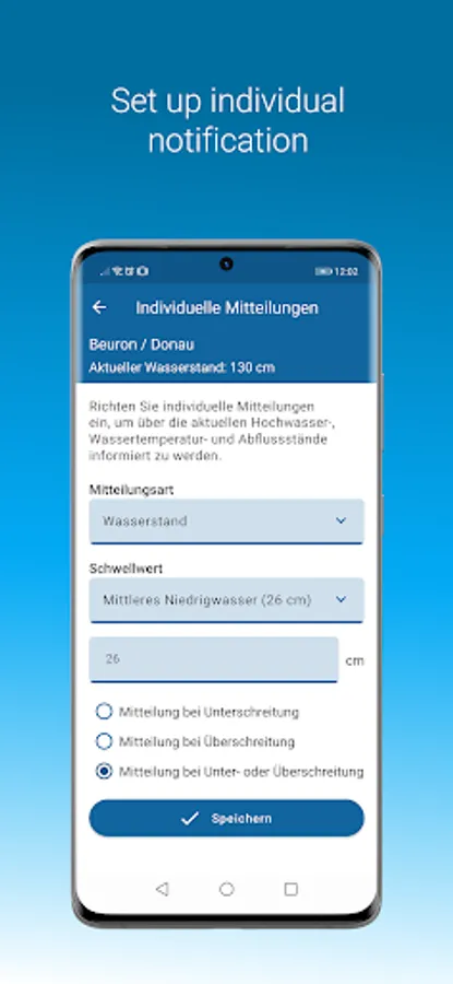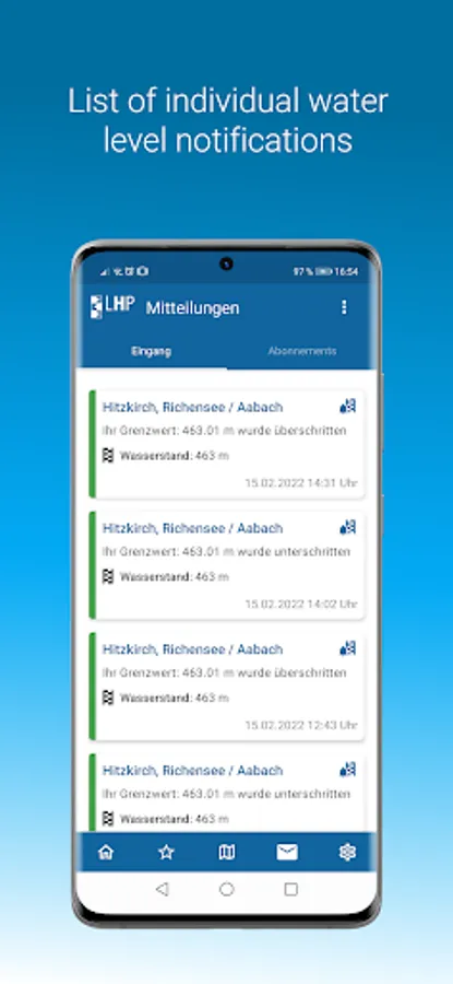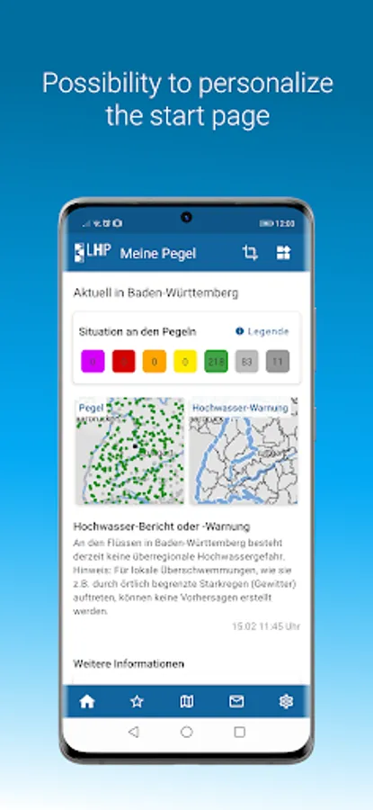 Depending on the data provision for the respective water level, the corresponding notification may therefore arrive on your smartphone between 15 and 45 minutes after the limit value has been exceeded or, in individual cases, even later. This time delay must be taken into account when setting the notification value.
